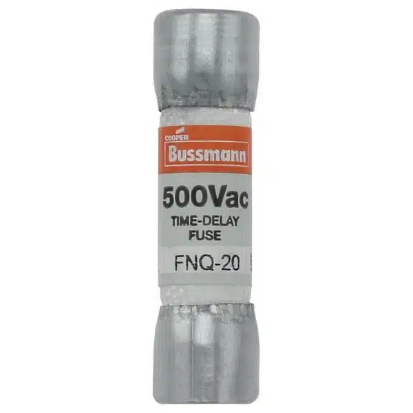 FNQ-20, Bussmann, FNQ Series, type FNQ, supplemental, time-delay fuse, 20A, 500Vac, 1 barrel, 0.41″ diameter, 10kA@500V AIC rating, UL listed, CSA certified low voltage fuse