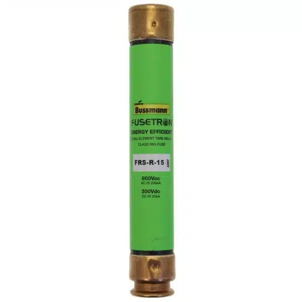 FRS-R-15, Bussmann, Fusetron, type FRS-R, Class RK5, low voltage fuse, 1 barrel, 0.81″ diameter, 15A, 600Vac/300Vdc, 200kA@600V, dual element, current-limiting, time-delay fuses