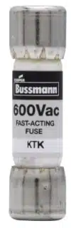 KTK-15, Bussmann, KTK Series, supplemental fuse, 15A, 600Vac, 1 barrel, 13/32″ diameter, 100kA@600V AC, fast-acting, UL listed, CSA certified low voltage fuse