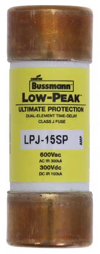 LPJ-15SP, Cooper Bussmann, Low-Peak, type LPJ, Class J low voltage fuse, non-indicating, 0.81″ diameter, 15A, 600Vac, 300Vdc, 300kA@600V AC, 100kA@300V DC, current limiting, dual element, time-delay, UL listed, CSA certified