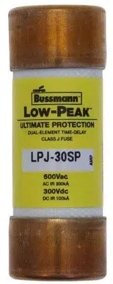 LPJ-30SP, Cooper Bussmann, Low-Peak, type LPJ, Class J low voltage fuse, non-indicating, 0.81″ diameter, 30A, 600Vac, 300Vdc, 300kA@600V AC, 100kA@300V DC, current limiting, dual element, time-delay, UL listed, CSA certified