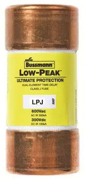 LPJ-40SP, Cooper Bussmann, Low-Peak, type LPJ, Class J low voltage fuse, non-indicating, 1.06″ diameter, 40A, 600Vac, 300Vdc, 300kA@600V AC, 100kA@300V DC, current limiting, dual element, time-delay, UL listed, CSA certified