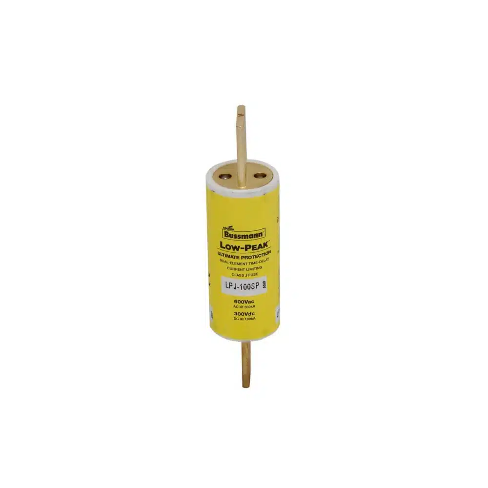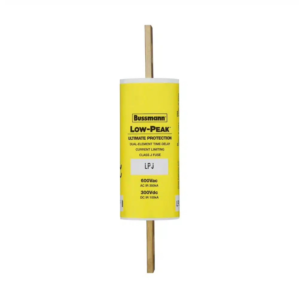 LPJ-90SP, Cooper Bussmann, Low-Peak, type LPJ, Class J fuse, 90A, 600Vac, 300Vdc, 300kA@600V AIC rating, 100kA@300V DC, current limiting, non-indicating, dual element, time-delay, UL listed, CSA certified low voltage fuse